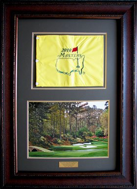 Red Leather Mahogany Frame.Forest Green & Gold Mat/ Includes Official Masters Flag from Augusta National. Nameplate & COA included. Finished Framed at approx. 30" X 50".