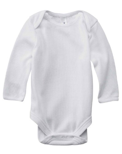 4.5 oz., 60% combed and ringspun cotton, 40% polyester 40 singles Mini thermal knit Envelope neck Leg opening with three snap closure Sideseamed