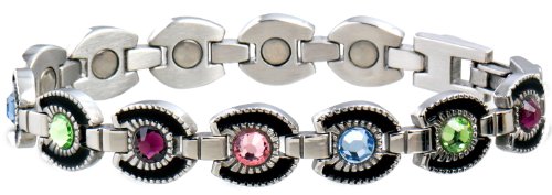 Bright and clear cubic zirconia gems set in attractive horseshoe design links with black accents make this bracelet unique. A 1200 gauss magnet is each link.