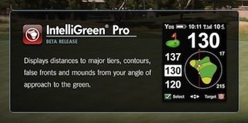 - IntelliGreen Pro (Beta): IntelliGreen Pro (Beta) is a dynamically enhanced version of IntelliGreen that adds the ability to display major tiers, contours, false fronts and mounds from your angle of approach to the green. With IntelliGreen Pro, you'll always know what's ahead, no matter where you are on the hole, even when you can't see the green.